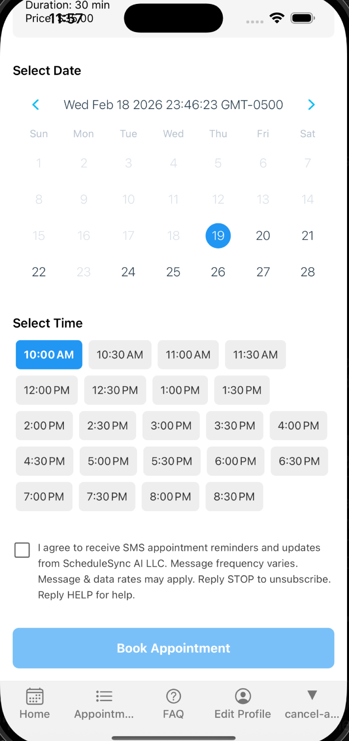 “I agree to receive SMS appointment reminders and updates from ScheduleSync AI LLC. Message frequency varies. Message & data rates may apply. Reply STOP to unsubscribe. Reply HELP for help.”